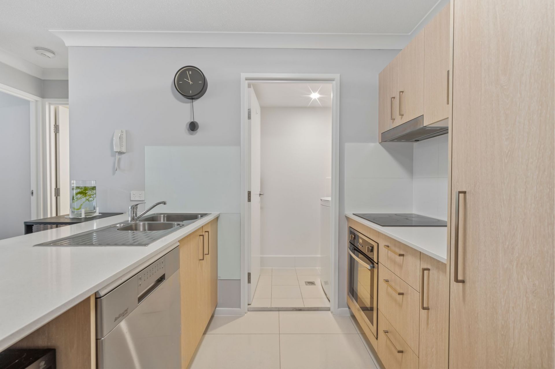 • Modern kitchen with stone benchtops, stainless steel appliances, tiled splashback and ample cabinetry